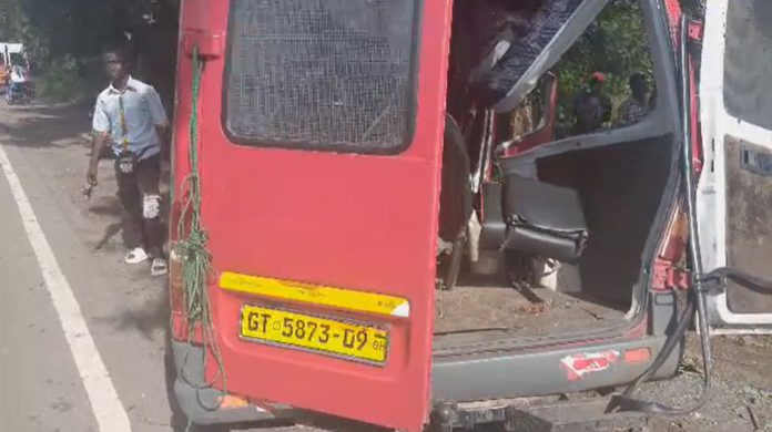 Information gathered indicates that a Sprinter bus with registration GT 5873-09 which was fully loaded from Kaneshie to Takoradi lost control after one of its back tyres burst.