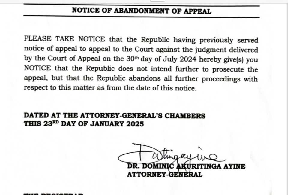 “PLEASE TAKE NOTICE that the Republic, having previously served notice of appeal to appeal to the Court against the judgment delivered by the Court of Appeal on the 30th day of July 2024 hereby give(s) you NOTICE that the Republic does not intend further to prosecute the appeal, but that the Republic abandons all further proceedings with respect to this matter as from the date of this notice”.
