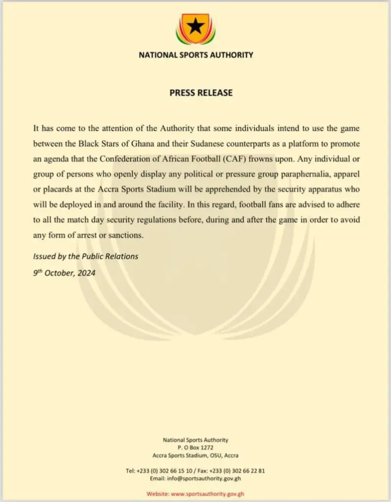 “Any individual or group of persons who openly displays any political or pressure group paraphernalia, apparel or placards at the Accra Sports Stadium will be apprehended by the security apparatus who will be deployed in and around the facility,” part of the statement read.