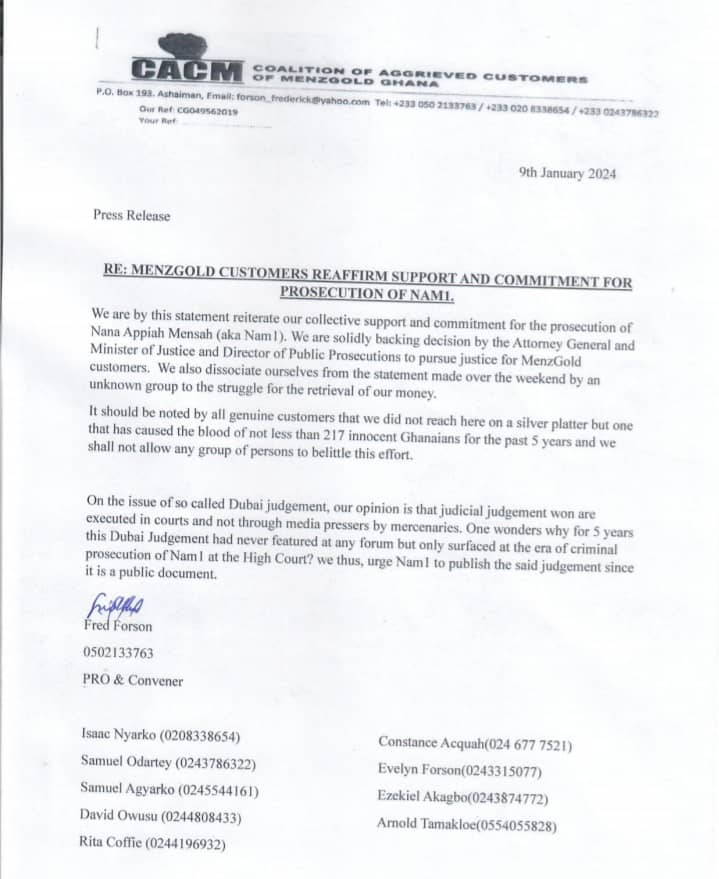 In a statement issued by the Coalition of Aggrieved Customers of Menzgold Ghana, dated January 9, 2024, the group said, “We are solidly backing the decision by the Attorney General and Minister of Justice and Director of Public Prosecutions to pursue justice for MenzGold customers”.