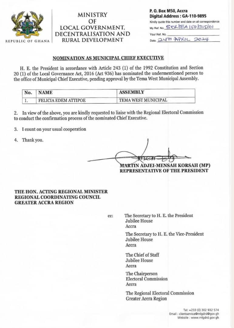 President Nana Akufo-Addo has nominated Felicia Edem Attipoe as the new Municipal Chief Executive (MCE) of the Tema West Municipal Assembly.