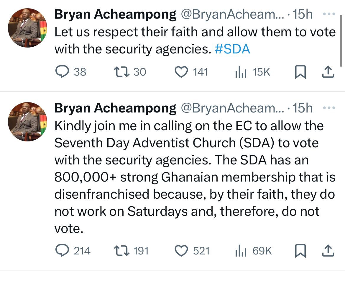 “Kindly join me in calling on the EC to allow the Seventh Day Adventist Church (SDA) to vote with the security agencies. The SDA has an 800,000+ strong Ghanaian membership that is disenfranchised because, by their faith, they do not work on Saturdays and, therefore, do not vote,” his post read.