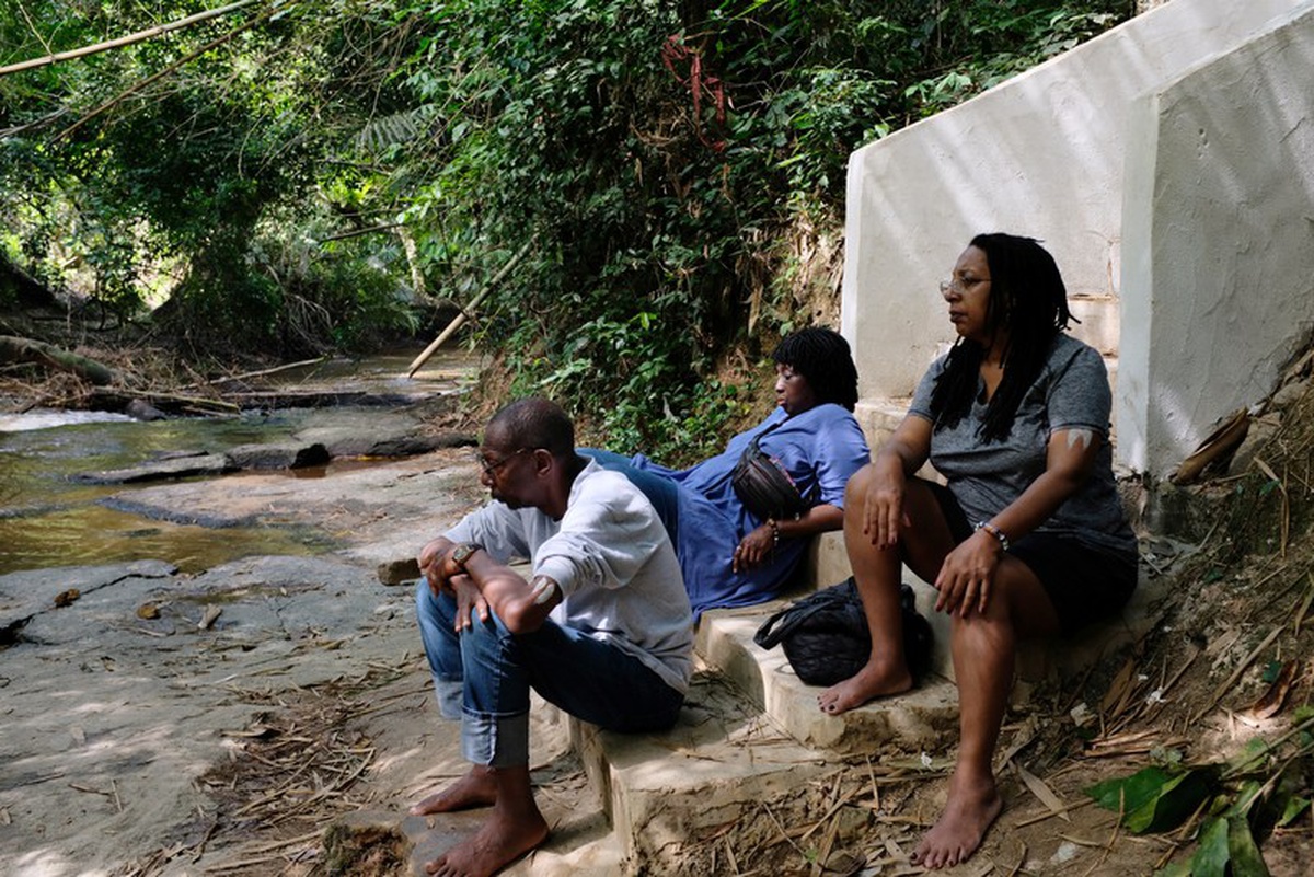 They picked their way down the bank past stands of bamboo to the shallow, sun-dappled water, helping the less sure-footed as they went. On the guide’s invitation, Sylvester stepped into the creek, closed her eyes and raised her hands in prayer.