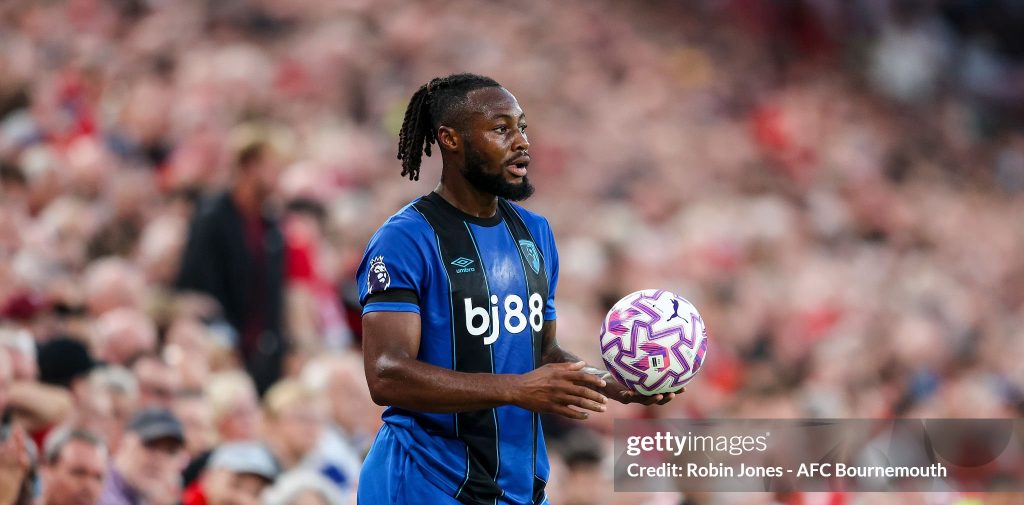 Antoine Semenyo of Bournemouth during the Premier League match (Photo by Robin Jones – AFC Bournemouth/AFC Bournemouth via Getty Images)