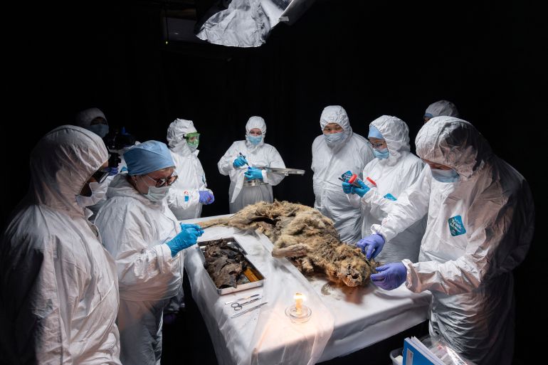 Russian scientists are performing an autopsy on a wolf frozen in permafrost…