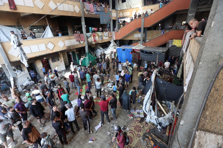 An Israeli air strike on a school-turned-shelter in the central Gaza Strip…