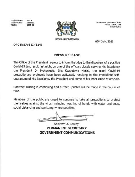 Botswana’s President, Mokgweetsi Eric Keabetswe Masisi has quarantined himself after an official working closely with him tested positive for the novel coronavirus.