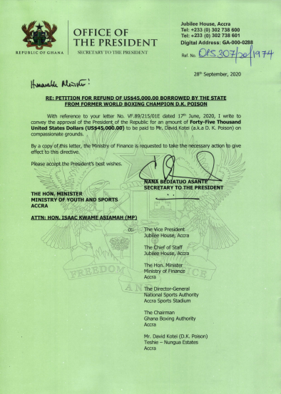 President Nana Addo Dankwa Akufo-Addo has approved an amount of $45,000 to settle the debt Ghana owes retired world boxing champion, David Kotei, popularly known as D.K. Poison.