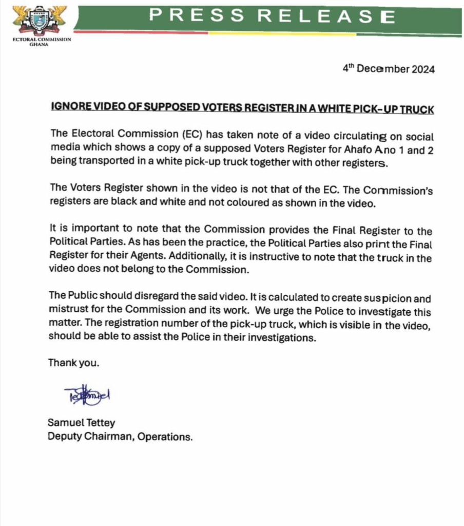 According to EC, the video is an attempt by some individuals to create suspicion and mistrust for its work while emphasising that the voters register in the video does not belong to the commission.