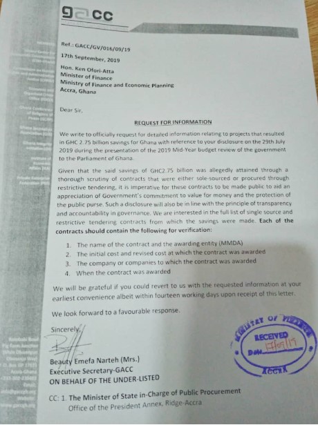 The Ghana Anti-Corruption Coalition (GACC) has petitioned the Minister for Finance, Ken Ofori-Atta to provide details on the over GH¢2bn reportedly saved through the review of sole-sourced and restricted tender contracts.
