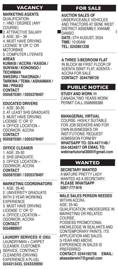 Prospective job seekers can find below the advertised jobs in the July 26, 2024, edition of Daily Graphic as published in the paper today.