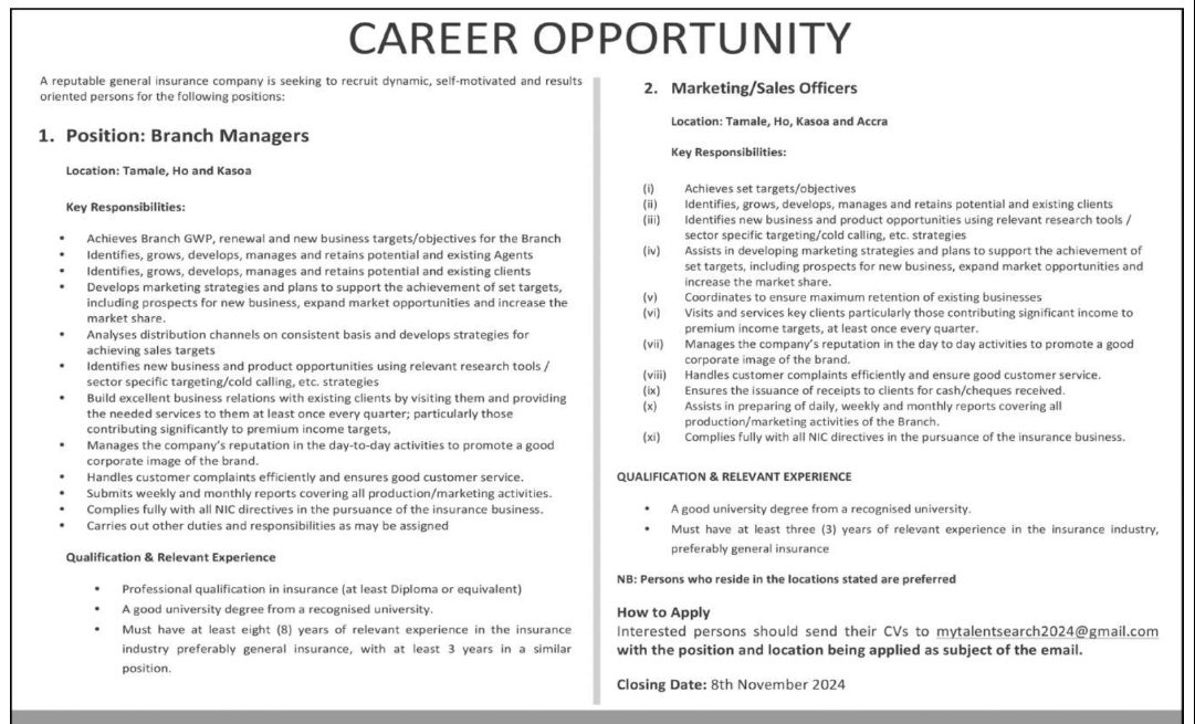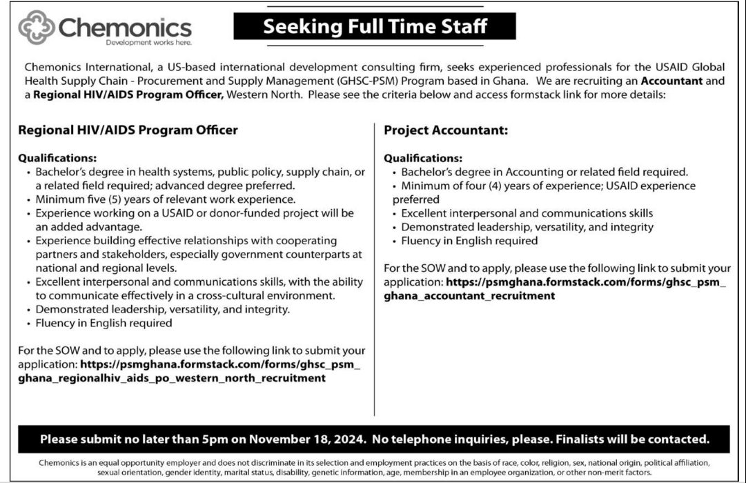 Prospective job seekers can find below the advertised jobs in the November 1, 2024, edition of Daily Graphic as published in the paper today.