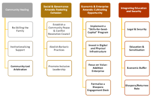 The core challenge here is to establish trust and a functioning local governance system that resolves disputes transparently. There is need to empower respected elders, women leaders, and returning professionals (lawyers, retired civil servants) to mediate land and family disputes using a blend of modern law and reformed customary practice. Focus on “Win-Win” collaboration rather than punitive measures to heal rifts.
