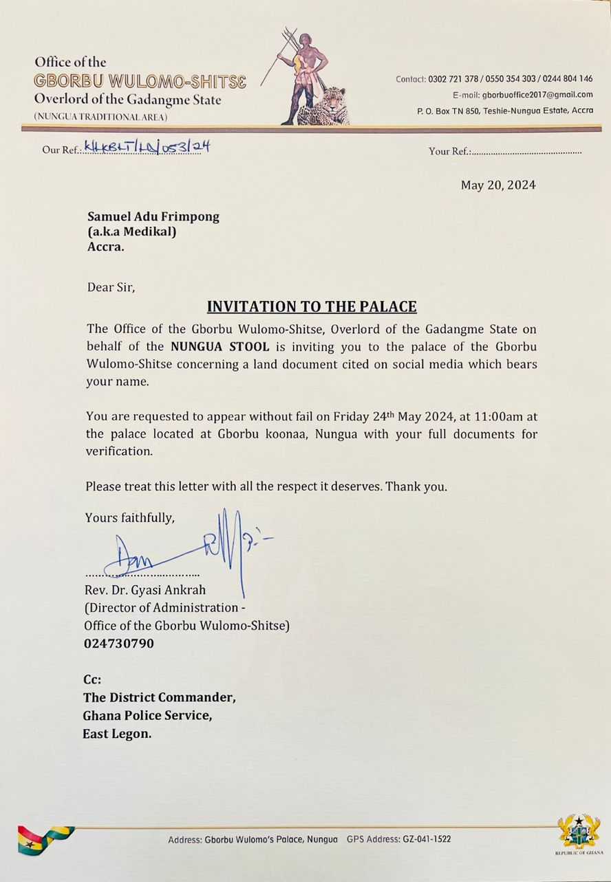 The Gborbu Wulomo-Shitse, the overlord of the Gadangme State has invited rapper Medikal and actress Fella Makafui to his palace over the purchase of land in Nungua.