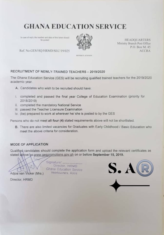 The Ghana Education Service (GES) has set requirement guidelines to recruit qualified newly trained teachers for the 2019/2020 academic year.