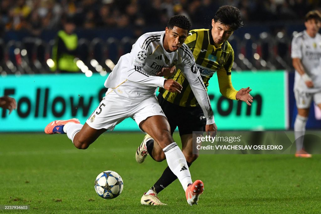 Real Madrid’s English midfielder #05 Jude Bellingham (L) and Kairat Almaty’s Kazakh midfielder #17 Olzhas Baibek (R) fight for the ball during the UEFA Champions League (Photo by VYACHESLAV OSELEDKO/AFP via Getty Images)