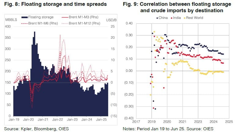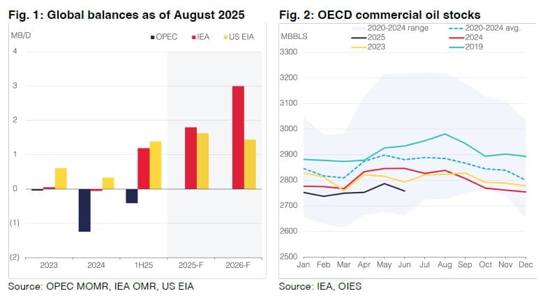 The OIES report maintains that stockpiling defies normal market logic, arguing that price structures do not point to a glut. Yet recent price movements suggest otherwise. Brent and WTI have shifted into contango, showing classic signs of easing balances and rising inventories. The market now appears to be behaving more in line with surplus dynamics, indicating that a glut may in fact be developing despite OIES’s interpretation.