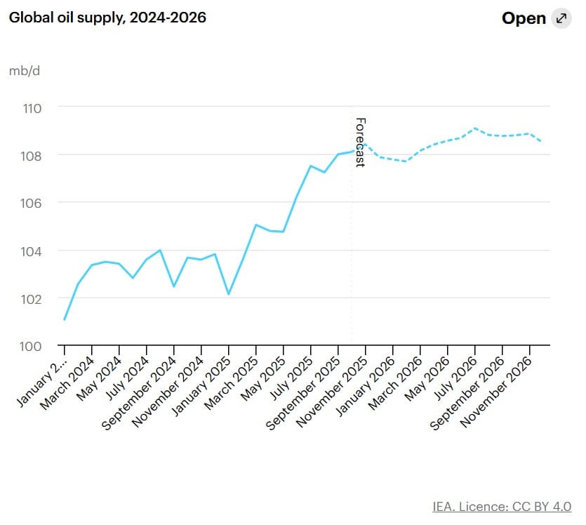 Then there is the International Energy Agency’s October report, which echoes that picture but scales it globally. The market ran an average surplus of 1.9 mb/d through the first nine months of 2025, adding 225 million barrels to world stocks – over a third in China. Outside China, inventories in advanced economies actually fell, and key pricing hubs like Cushing remain low. This split explains why prices have held firm even as global supply, up roughly 3 mb/d in 2025, outpaces demand growth of only about 700 kb/d.