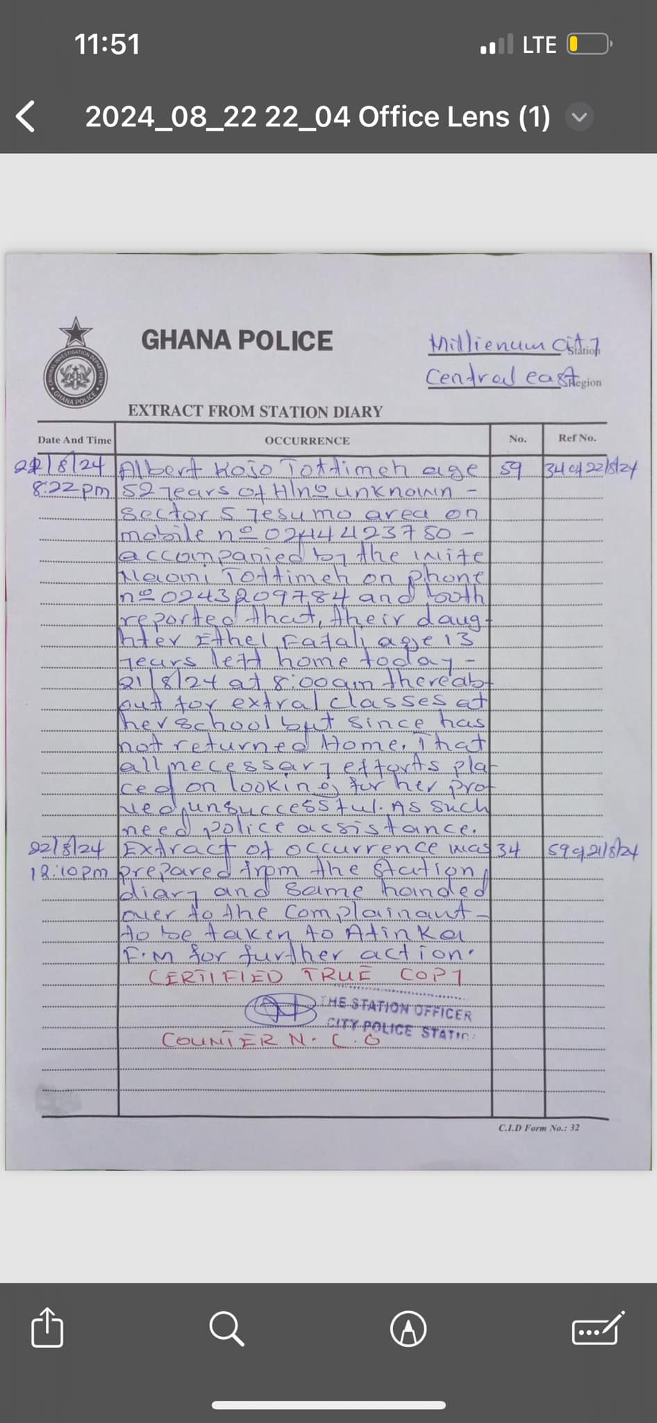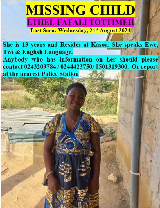 Ethel who speaks Ewe, Twi, and English, went missing after she left home for extra classes on August 21, 2024.