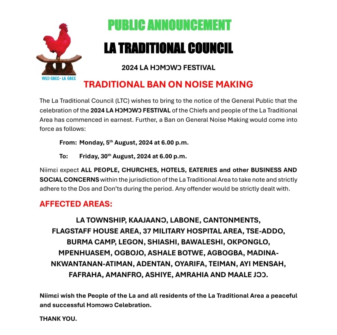 The La Traditional Council (LTC) has announced that this year’s ban on drumming and noise-making will commence on Monday, August 5, 2024.