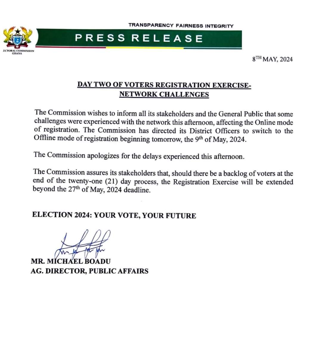 The Electoral Commission (EC) has directed its district officers to transition to the offline mode of registration starting Thursday, May 9, 2024.