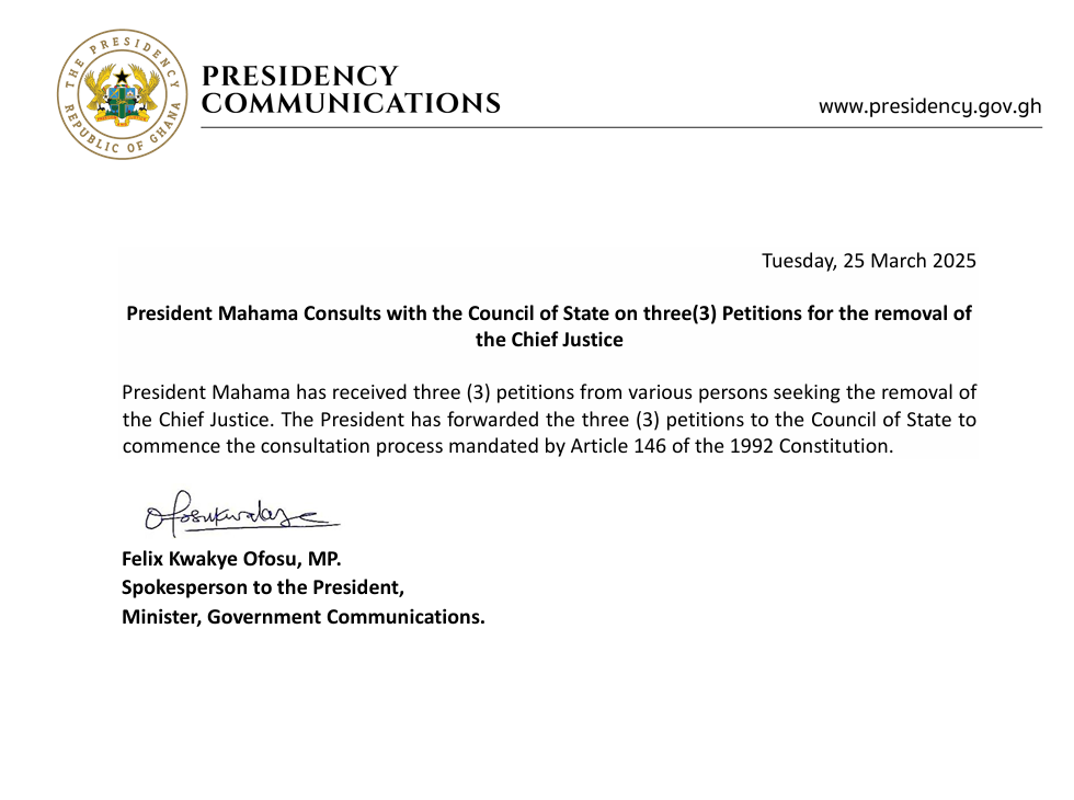 A letter signed by Felix Kwakye Ofosu, the Spokesperson to the President and Minister for Government Communications, indicated that all these petitions have been sent to the Council of State, following the constitutional procedures set out in Article 146 of the 1992 Constitution.