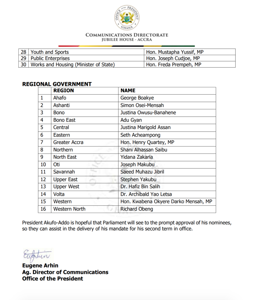 In all, President Akufo-Addo has appointed 30 Ministers and 16 Regional Ministers, bringing the total number of ministers to 46.
