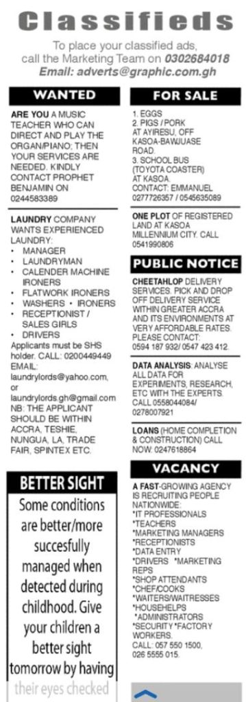 Prospective job seekers can find below the advertised jobs and bidding contracts in the May 4, 2020 edition of Daily Graphic as published in the paper today.