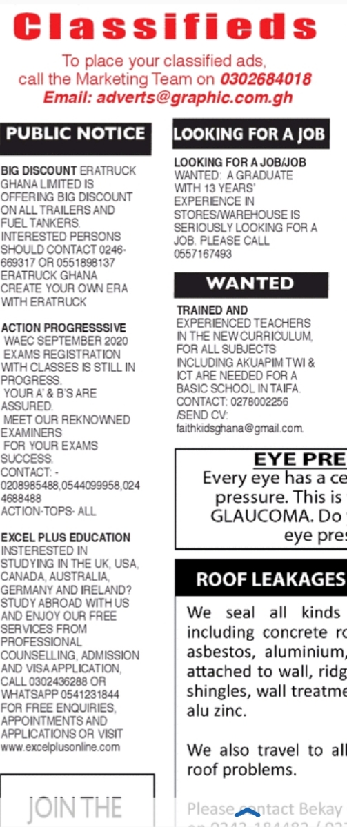 Prospective job seekers can find below the advertised jobs in the June 8, 2020 edition of Daily Graphic as published in the paper today.