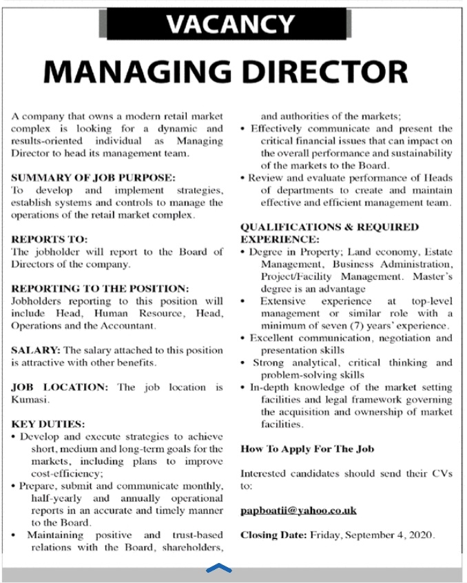 Prospective job seekers can find below the advertised job in the August 31, 2020 edition of Daily Graphic as published in the paper today.
