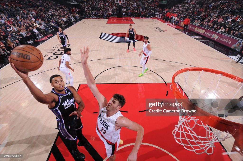 Keegan Murray #13 of the Sacramento Kings drives to the basket during the game against the Portland Trail Blazers (Photo by Cameron Browne/NBAE via Getty Images)