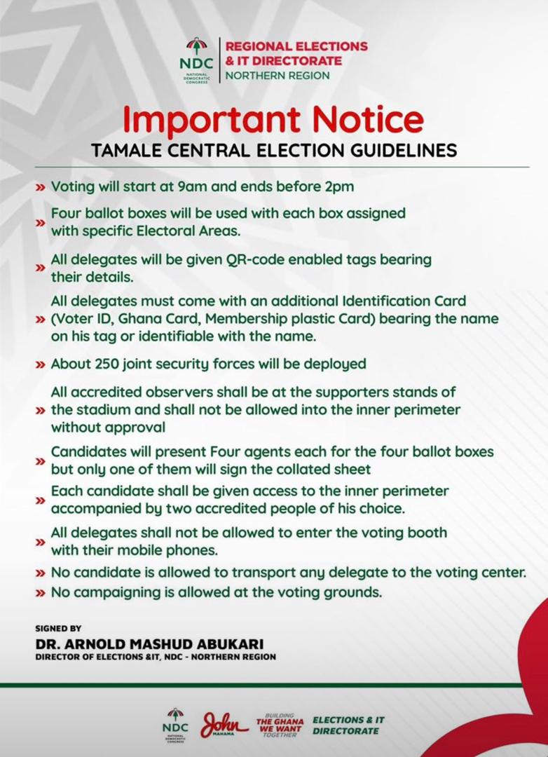 The Northern Regional Directorate of Elections and IT of the National Democratic Congress (NDC) has announced critical guidelines for the upcoming Tamale Central parliamentary primary, scheduled for Saturday, September 6, 2025.