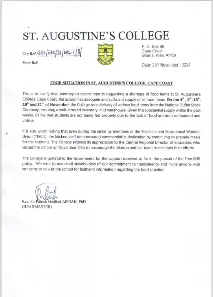Management of St. Augustine’s College, Cape Coast, has debunked reports suggesting a food shortage on campus.
