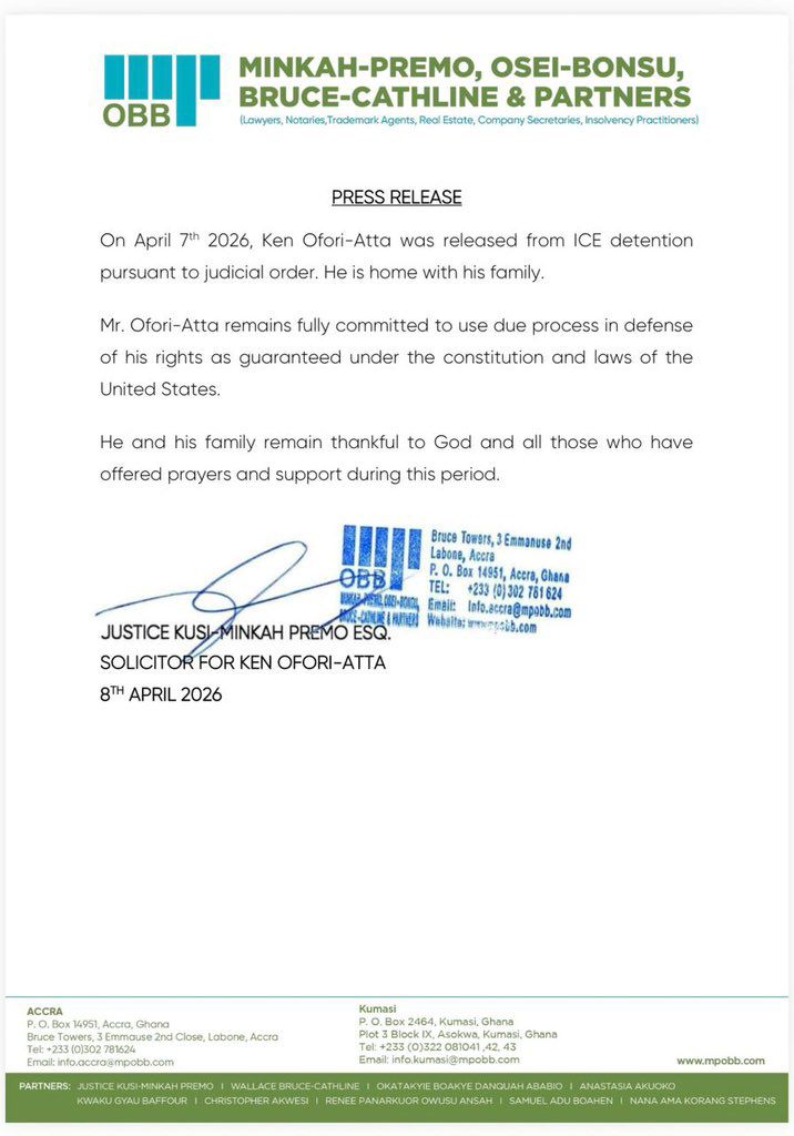 In a statement released on April 8, 2026, his lawyers, Minkah-Premo, Osei-Bonsu, Bruce-Cathline and Partners, explained that he was freed on April 7, 2026, and has now returned home to be with his family.
