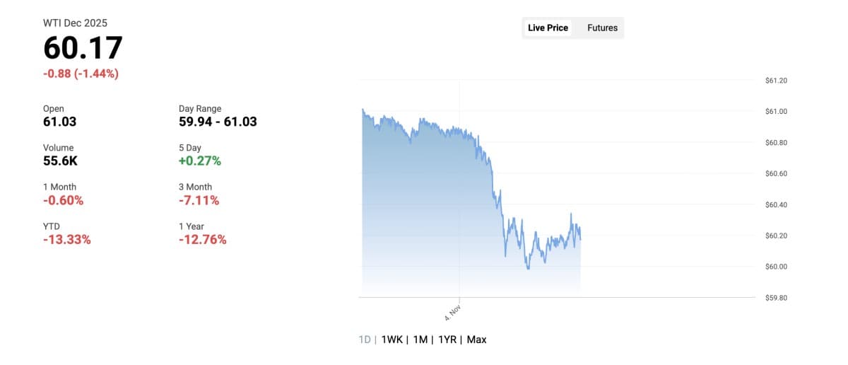As of 8:44 a.m. ET on Tuesday, the U.S. benchmark price, WTI Crude, was flirting with the sub-$60 a barrel price it reached two weeks ago after the Trump Administration slapped sanctions on Russia’s biggest oil firms, Rosneft and Lukoil. The U.S. benchmark crude futures were trading down by 1.44% at $60.17.