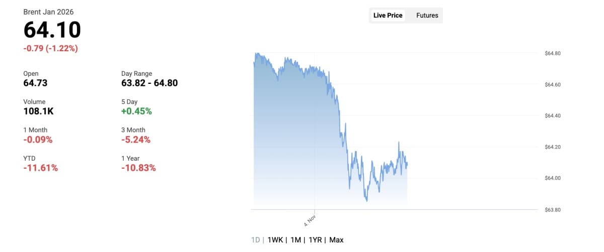 The international benchmark, Brent Crude, slipped below $65 per barrel as it was down by 1.22% on the day at $64.10.