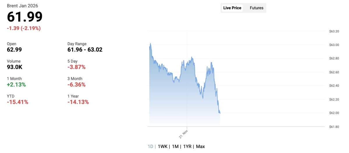 News of Zelenskyy considering the peace proposal comes on the same day that new U.S. sanctions on Rosneft and Lukoil officially take effect, targeting key subsidiaries in an effort to restrict Kremlin revenue from fossil-fuel sales. While those sanctions should tighten supply, that has largely been baked into markets at this point.