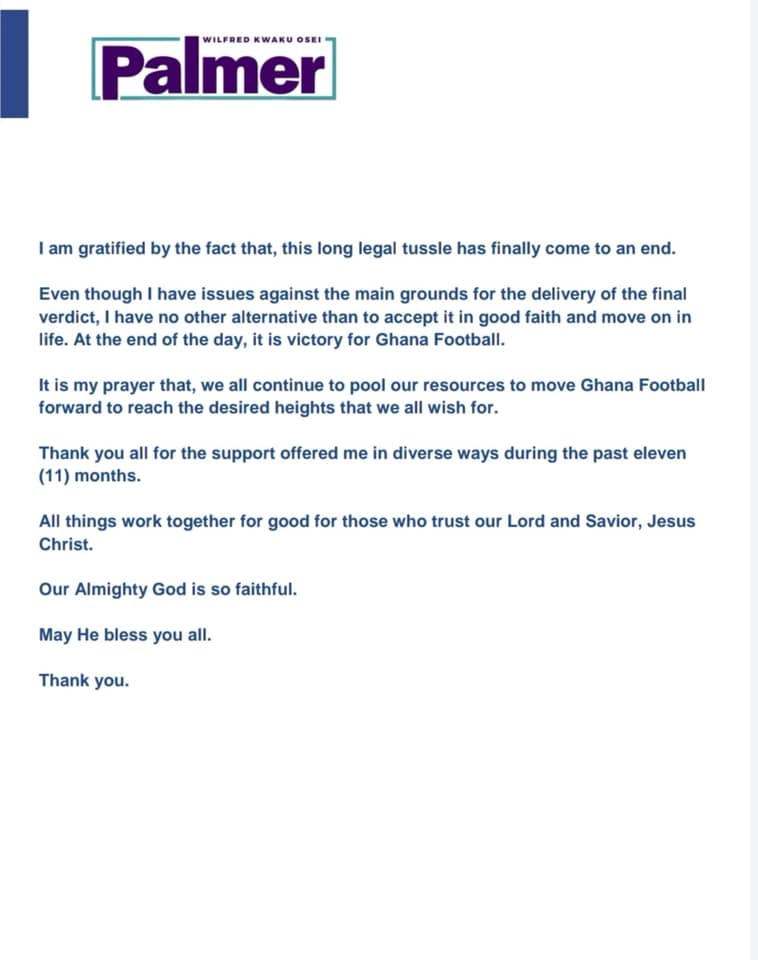 Wilfred Kweku Osei, affectionately called Osei Palmer has said he accepts the ruling by the Court of Arbitration for Sports on his appeal case contesting the legitimacy of the current leadership of the FA.