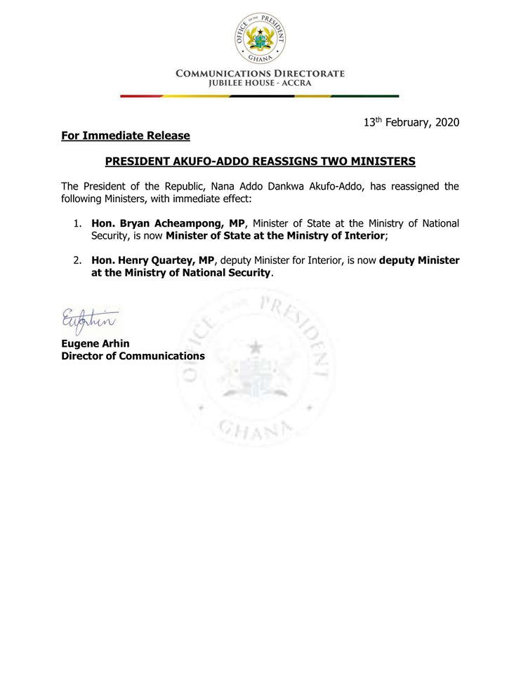 President Akufo Addo has reassigned the Minister of State at the Ministry of National Security, Bryan Acheampong.