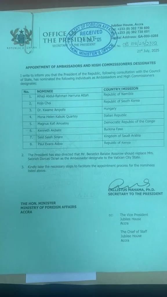 In a letter dated July 21, 2025, addressed to the Minister for Foreign Affairs and signed by Dr. Callistus Mahama, Secretary to the President, it was revealed that eight individuals have been selected after consultations with the Council of State.