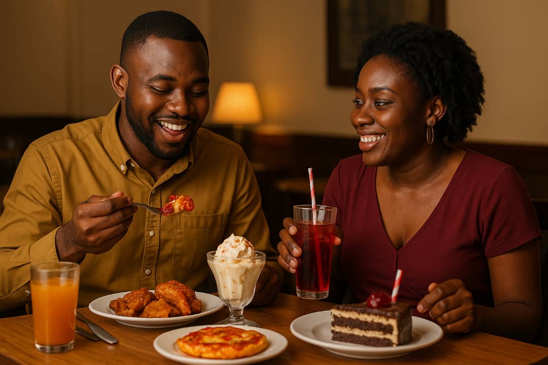 A young couple enjoying sugary meals and drinks during a cozy evening date