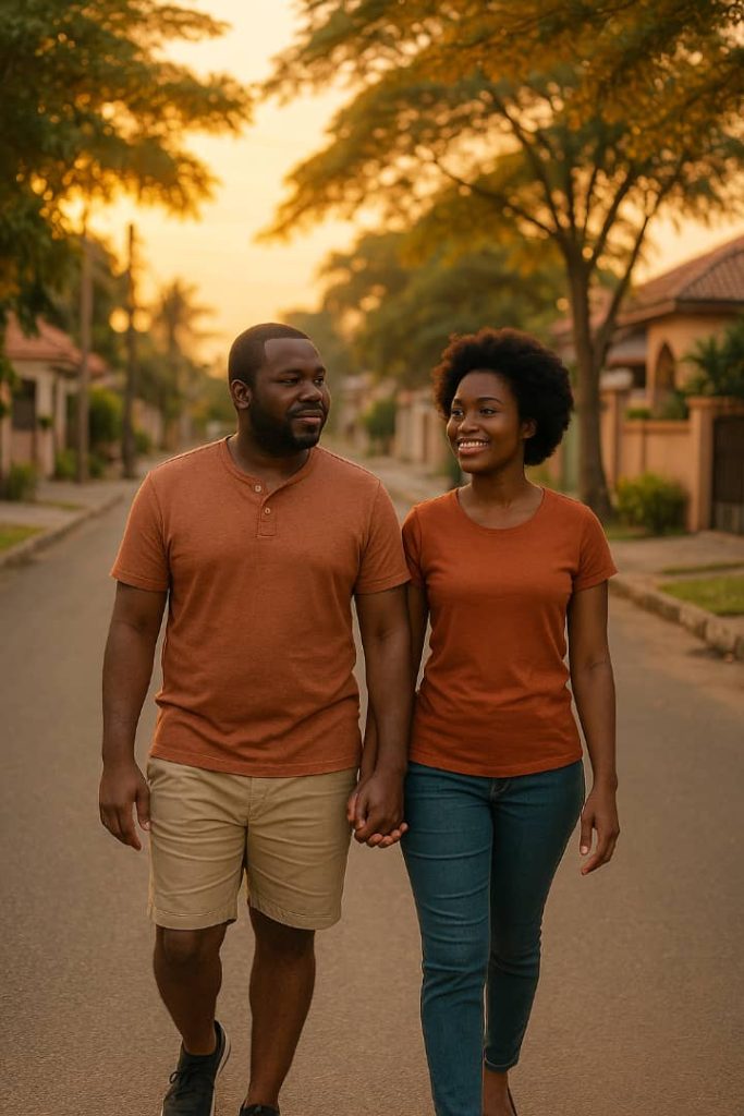 An AI generated photograph of a couple taking a peaceful evening walk after dinner for better health.