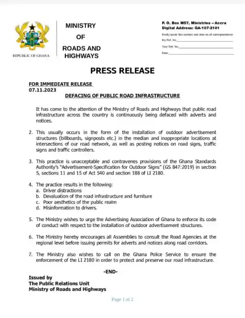 The Ministry of Roads and Highways has cautioned the public against the unlawful practice of defacing public road infrastructure with the installation of outdoor advertisement structures like billboards, posters, and signposts.