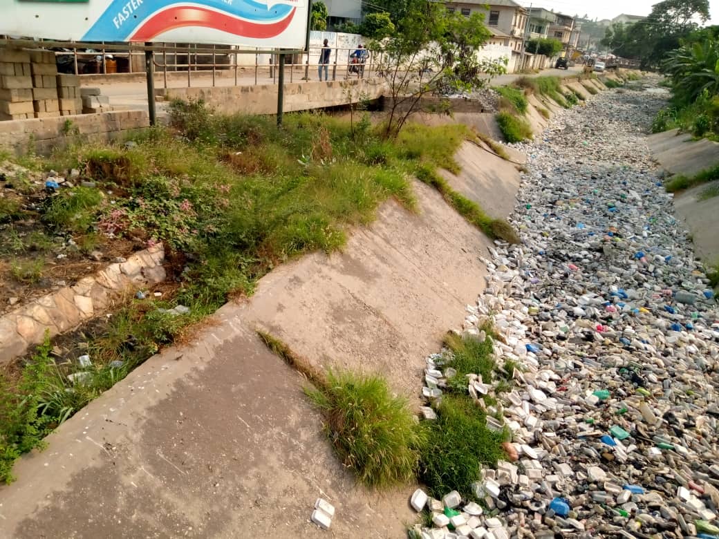 A million plastic bottles gridlocked in a storm drain in Accra is…