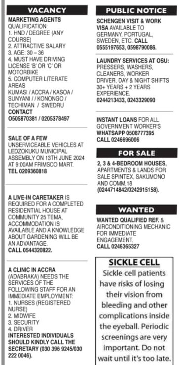 Prospective job seekers can find below the advertised jobs in the June 6, 2024, edition of Daily Graphic as published in the paper today.