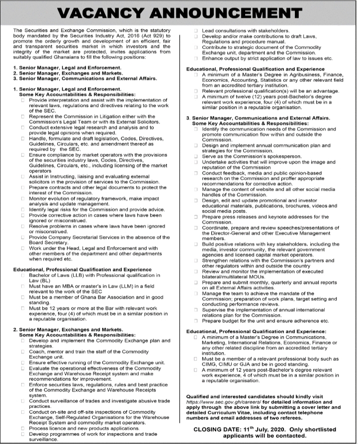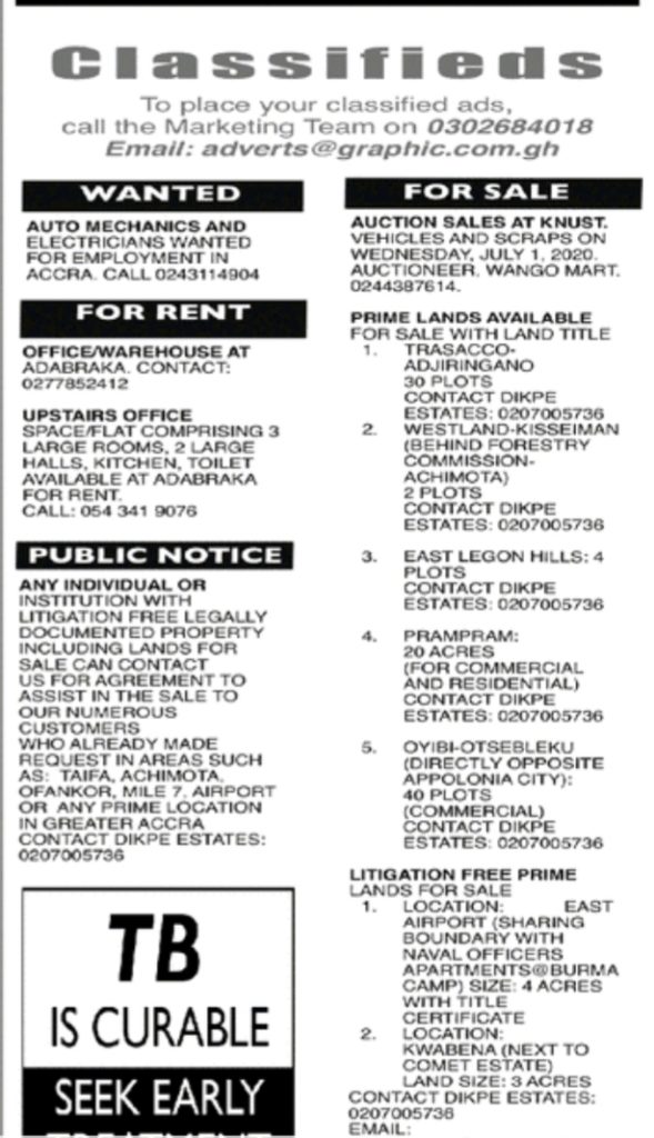 Prospective job seekers can find below the advertised jobs in the June 30, 2020 edition of Daily Graphic as published in the paper today.