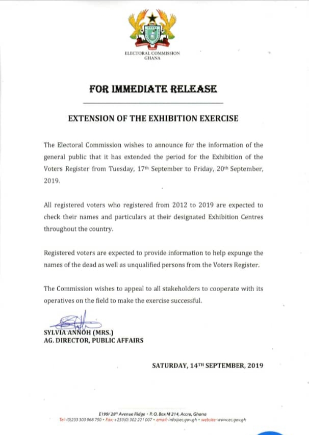 The Electoral Commission has announced an extension of the exhibition of the Voters’ Register to Friday, 20th September, 2019.