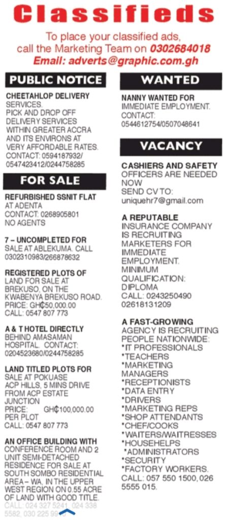 Prospective job seekers can find below the advertised jobs in the July 22, 2020 edition of Daily Graphic as published in the paper today.