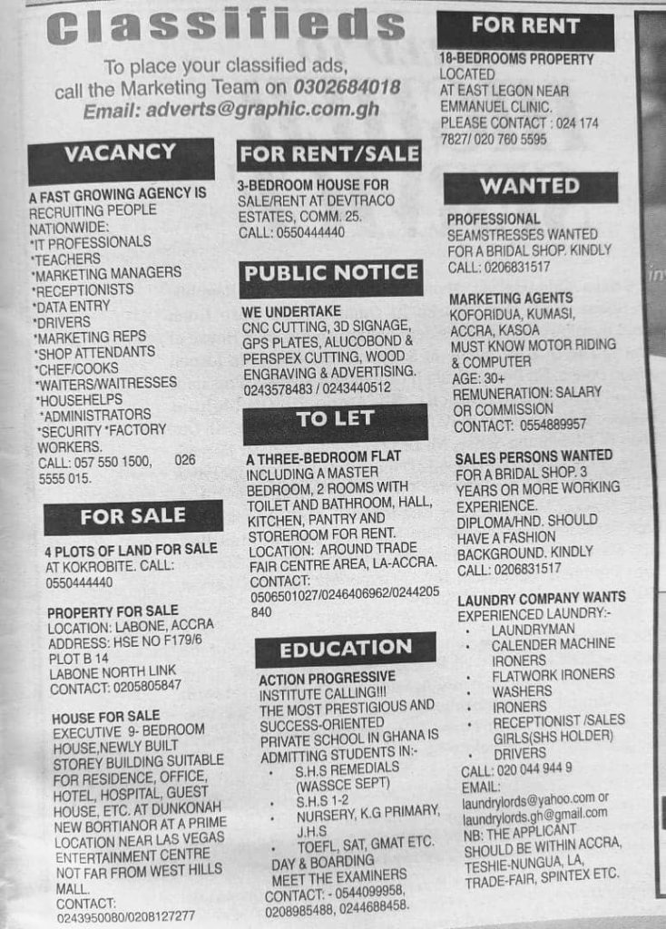 Prospective job seekers can find below the advertised jobs in the February 19, 2020 edition of Daily Graphic newspaper as published in the paper today.